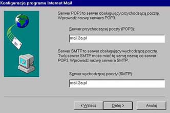 W poniższym okienku należy wpisać adresy serwerów poczty przychodzącej i wychodzącej. Zamiast adresów można podać adres IP. Po wypełnieniu dwóch pól należy nacisnąć przycisk "Dalej>".