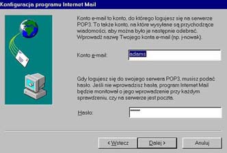 W tym oknie należy wpisać nazwę i hasło dostępu do konta pocztowego. Okno i pola, gdzie trzeba te informacje wypełnic pokazane jest poniżej.