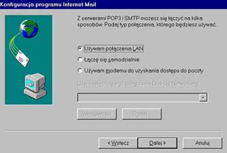 Po zaznaczeniu opcji należy nacisnąć przycisk "Dalej>". Jeżeli wszystko odbyło się poprawnie ukaże się okienko z gratulacjami, gdzie trzeba nacisnąć przycisk "Zakończ". Po tym program Internet Mail jest skonfigurowany do korzystania z poczty elektronicznej.