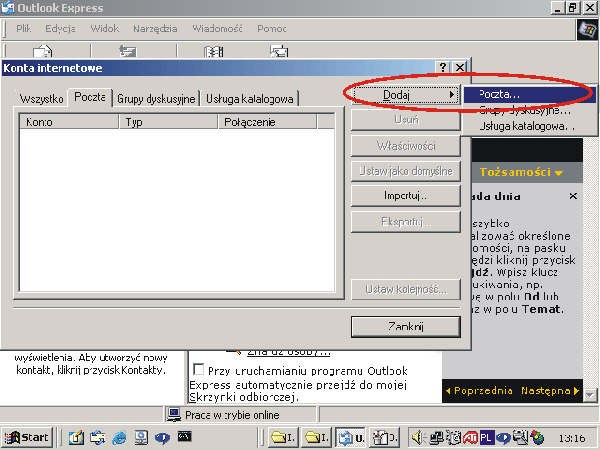 Należy wybrać zakładkę >Poczta<. W oknie tym znajduje się ona między zakładkami >Wszystkie< i >Grupy dyskusyjne<. Tam dostępne są informacje o już skonfigurowanych kontach pocztowych. Następnie trzeba nacisnąć przycisk >Dodaj< po lewej stronie i w menu które pojawi się obok okna >Poczta...<.
