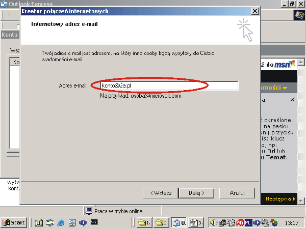 Teraz pojawi się okno, w ktorym należy wpisać adres e-mail. Przy włączonej pierwszej, opisanej "Posiadam już adres itd.", opcji trzeba wpisać adres e-mailowy przydzielony przez 2A Sp. z o.o. Zwykle jest to adres o postaci konto@2a.pl, który otrzymali Państwo razem z innymi informacjami konfiguracyjnym od 2A Sp. z o.o.