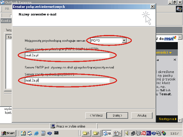 W następnym oknie należy wpisać adresy serwerów poczty przychodzącej i wychodzącej. Najpierw jednak trzeba wybrać rodzaj serwera poczty przychodzącej jest nim POP3, co trzeba wybrać z listy na pierwszej pozycji w oknie. Następnie należy wpisać adres serwera poczty przychodzącej i wychodzącej w polach oznaczonych odpowiednimi opisami. Zazwyczaj oba adresy mają tą samą postać "mail.2a.pl". Adresy te otrzymują Państwo od 2A Sp. z o.o. razem z innymi informacjami koniecznymi do konfiguracji. Poniższy rysunek przedstawia okno z wpisanymi już adresami.
